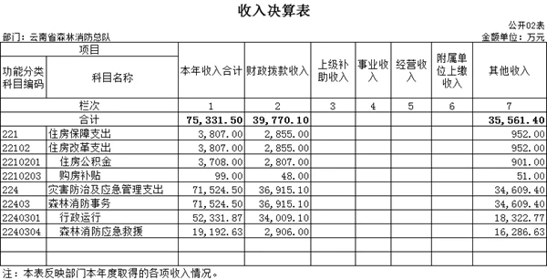 二、其他收入:指除上述“一般公共预算拨款收入”以外的收入。云南省森林消防总队的其他收入主要是地方财政部门拨付的经费。