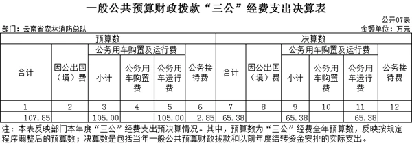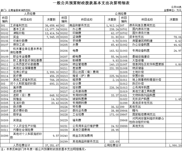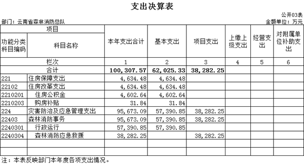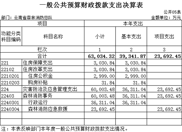 七、灾害防治及应急管理支出(类)森林消防事务(款)行政运行(项):指云南省森林消防总队各级用于保障机构正常运行、开展日常工作的基本支出。