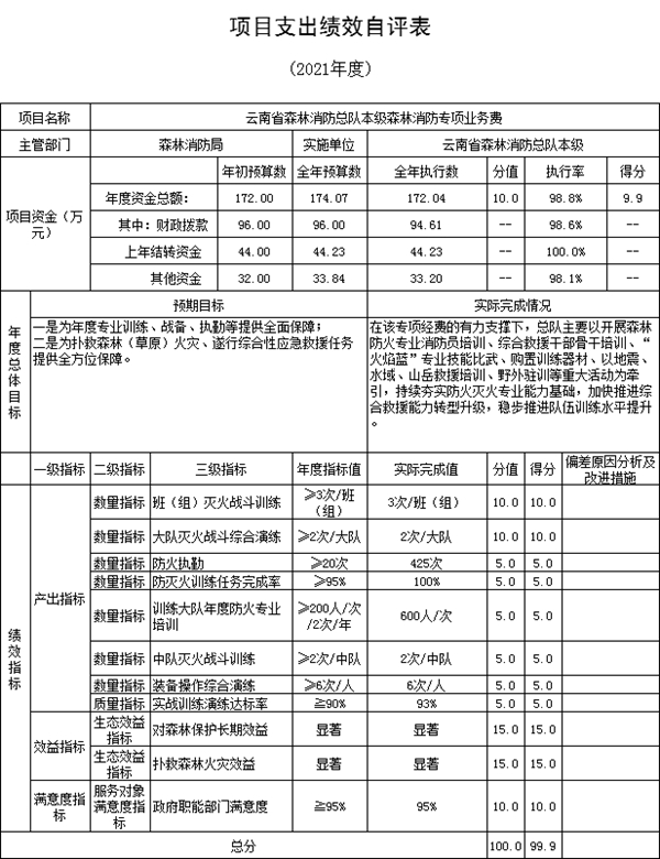森林消防专项业务费项目绩效自评综述:根据年初设定的绩效目标,项目自评得分为99.9分。项目全年预算数174.07万元,执行数为172.04万元,完成预算的98.8%。项目绩效目标完成情况:完成班(组)灭火战斗训练3次、大队灭火战斗综合演练2次、防火执勤425次、训练大队年度防火专业培训600人次、中队灭火战斗训练2次、装备操作综合演练6次,购置并配发了相关训练演练、灭火救援物资器材,为总队消防救援人员圆满完成训练、执勤和灭火救援各项任务提供坚实保障。发现的主要问题及原因:受任务需求变化影响,项目的预算调剂内容较多。下一步改进措施:一是加强需求的研究论证,减少预算执行中的调整;二是加强过程管控,提高资金使用绩效;三是制定项目支出标准和管理制度规范,推动项目绩效管理水平不断提升。
