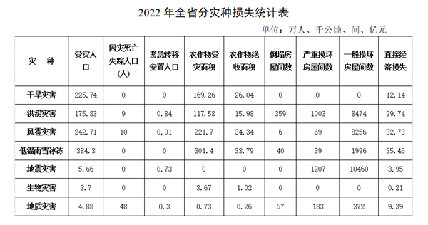 2022年因风雹灾害共造成全省16个州(市)122个县(市、区)242.71万人次不同程度受灾,因灾死亡失踪10人,紧急避险转移131人次,紧急转移安置120人次;农作物受灾面积221.70千公顷,绝收面积34.34千公顷;房屋倒塌6间,严重损坏69间,一般损坏8256间;直接经济损失32.73亿元。与近5年均值相比,其中受灾人口增加151.54%、因灾死亡失踪人口增加61.29%、紧急转移安置人口下降75.94%、农作物受灾面积增加200.46%、农作物绝收面积增加163.88%、房屋倒塌下降92.77%、房屋严重损坏下降80.74%、房屋一般损坏下降61.45%、直接经济损失下降186.98%。