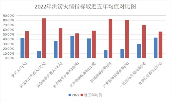 2022年因洪涝灾害共造成全省16个州(市)122个县(市、区)175.83万人次不同程度受灾,因灾死亡失踪9人,紧急避险转移10741人次,紧急转移安置8369人次;农作物受灾面积117.58千公顷,绝收面积15.98千公顷;房屋倒塌359间,严重损坏1003间,一般损坏8474间;直接经济损失29.74亿元。与近5年均值相比,各项灾情指标均呈现下降趋势,其中受灾人口下降23.77%、因灾死亡失踪人口下降81.40%、紧急转移安置人口下降41.94%、农作物受灾面积下降9.34%、农作物绝收面积下降28.07%、房屋倒塌下降78.58%、房屋严重损坏下降75.91%、房屋一般损坏下降58.35%、直接经济损失下降23.41%。