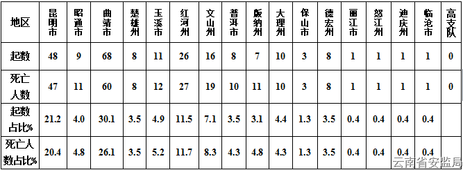 较大事故:昆明市1起、6人;曲靖市2起、7人;昭通市1起、5人;普洱市1起、4人;文山州1起、4人;西双版纳州1起、4人。