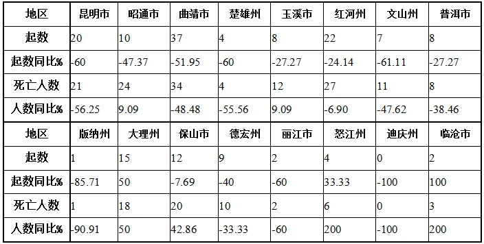 较大事故:昭通市4起、死亡17人,同比增加2起、9人,上升100%、112.5%;保山市2起、死亡10人,去年同期未发生较大事故;文山2起、死亡7人,同比增加1起、3人,上升100%、75%;昆明市1起、死亡3人,起数与去年同期持平,死亡人数减少3人,下降50%;曲靖市1起、死亡4人,同比减少1起、3人,下降50%、42.86%;玉溪市1起、死亡4人,同比增加1起、4人;大理州1起、死亡3人,同比增加1起、3人。