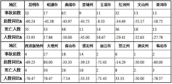 较大事故:昭通市5起、死亡20人,同比增加3起、12人,均上升150%;保山市2起、死亡10人,去年同期未发生较大事故;文山州2起、死亡7人,同比减少1起、5人,下降33.33%、41.67%;昆明市2起、死亡6人,起数与去年同期持平,人数减少3人、下降33.33%;曲靖市1起、死亡4人,同比减少1起、3人,下降50%、42.86%;楚雄州1起、死亡4人,同比减少1起、3人,下降50%、42.86%;玉溪市1起、死亡4人,同比增加1起、4人;大理州1起、死亡3人,起数和人数均与去年同期持平;丽江市、普洱市、临沧市、红河州、西双版纳州、德宏州、怒江州、迪庆州等8州市未发生较大事故。