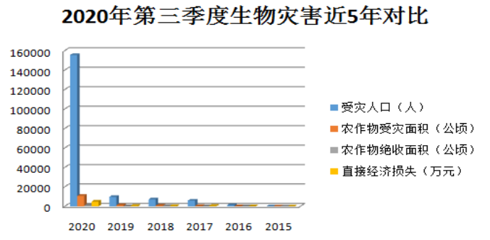 (三)生物灾害为近5年来最重的一年。三季度先后发生蝗虫、草地贪夜蛾、鼠害、玉米钻心虫害、水稻稻瘟等生物灾害,为5年来最重的一年。