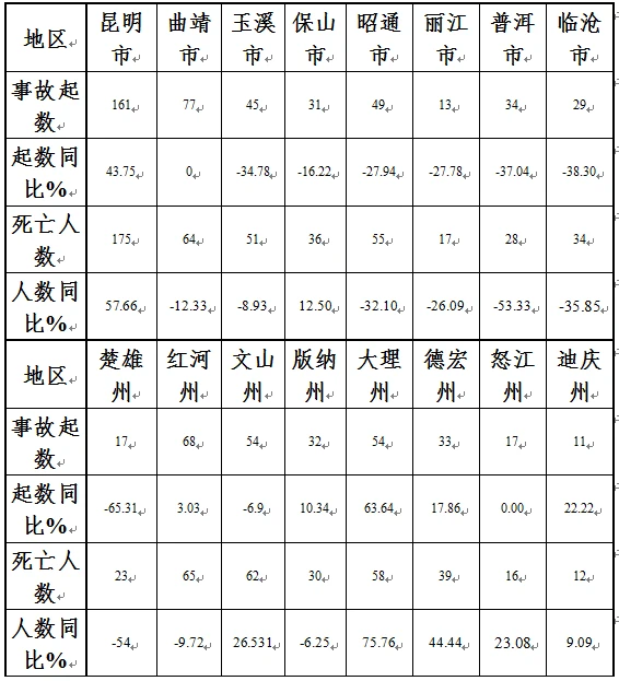 昆明市4起、死亡14人,同比增加1起、5人;昭通市2起、死亡6人,同比减少2起、7人;丽江市2起、死亡6人,同比起数持平、死亡人数减少1人;文山州2起、死亡7人,同比增加1起、4人;德宏州2起、死亡6人,同比增加2起、6人;玉溪市1起、死亡5人,同比增加1起、5人;保山市1起、死亡3人,同比增加1起、3人;临沧市1起、死亡4人,同比减少1起、2人;楚雄州1起、死亡3人,同比增加1起、3人;大理州1起、死亡3人,同比起数持平、死亡人数减少1人;其余6州市未接报较大事故,其中:曲靖市同比减少3起、12人;普洱同比减少1起、7人;西双版纳州同比减少1起、3人。