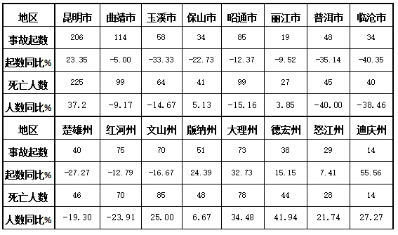 较大事故:昆明市5起、死亡17人,同比增加3起、11人;文山州5起、死亡18人,同比增加2起、9人;昭通市4起、死亡12人,同比减少1起、4人;丽江市3起、死亡11人,同比增加1起、4人;保山市2起、死亡6人,同比增加2起、6人;德宏州2起、死亡6人,同比增加2起、6人;玉溪市1起、死亡5人,同比增加1起、5人;临沧市1起、死亡4人,同比减少2起、5人;楚雄州1起、死亡3人,同比增加1起、3人;大理州1起、死亡3人,同比减少1起、4人;普洱市1起、死亡5人,同比起数持平、死亡人数减少2人;其余5州市未接报较大事故,其中:曲靖市同比减少3起、12人;普洱同比减少1起、7人;西双版纳州同比减少1起、3人。
