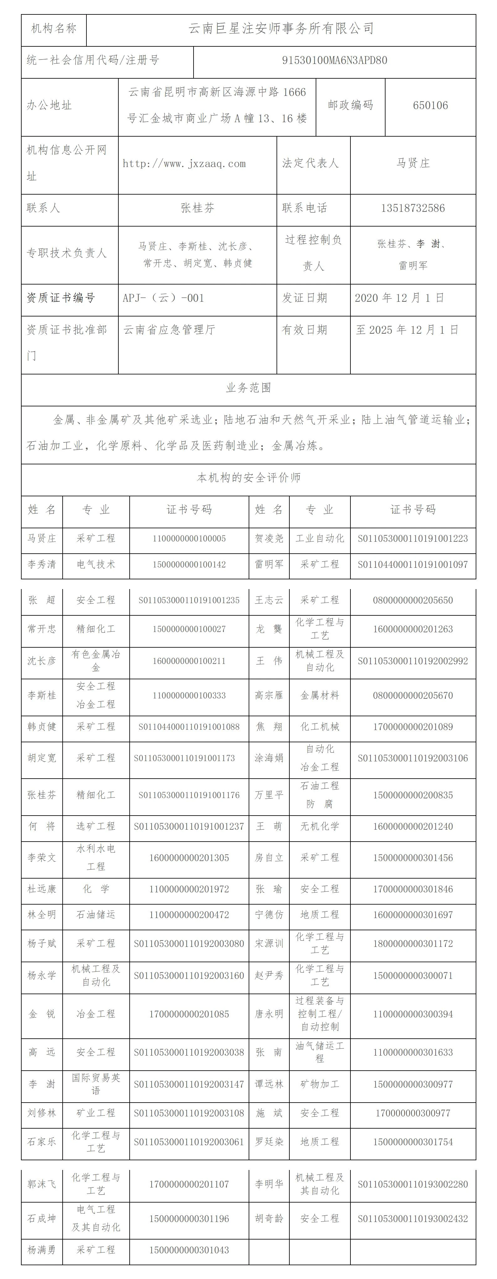 云南巨星注安师事务所有限公司安全评价机构信息公开表