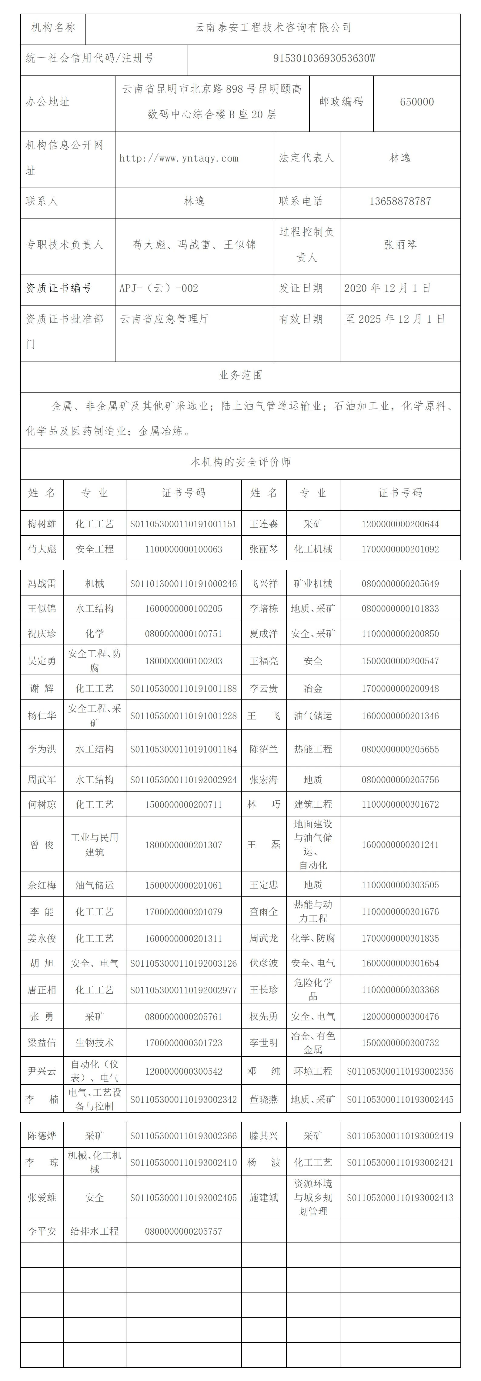 云南泰安工程技术咨询有限公司安全评价机构信息公开表