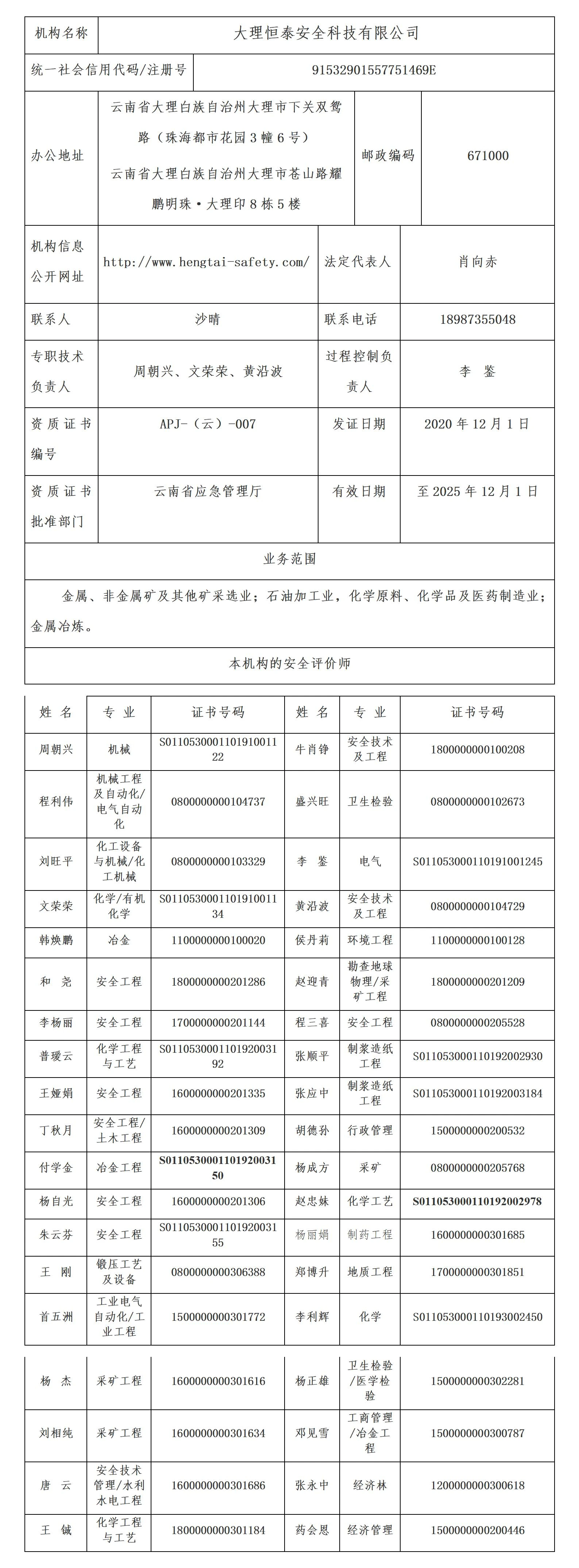 大理恒泰安全科技有限公司安全评价机构信息公开表
