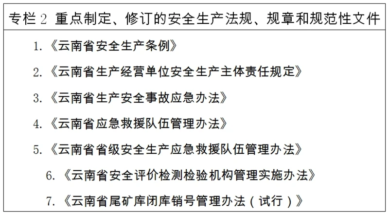 完善安全法规标准。修订《云南省安全生产条例》,制定或修订与《云南省安全生产条例》配套的政府规章及规范性文件。加快制定出台氢能、页岩气等绿色能源产业和绿色铝、绿色硅等绿色制造业安全生产地方性标准。完善城市高层建筑、大型商业综合体、综合交通枢纽、隧道桥梁、管线管廊、道路交通、轨道交通、加油(气)站、燃气工程、排水防涝、垃圾填埋场、渣土受纳场、电力设施及电梯、大型游乐设施等地方标准。加强安全生产地方性法规规章和规范性文件的立改废释工作。开展安全生产规范性文件集中清理和专项审查,增强安全生产法治建设的系统性、可操作性。加强对安全生产执法检查、事故查处、行政执法案卷评查、典型执法案例等结果的运用,建立执法信息反馈、立法后评估与立法清理相结合的长效机制。