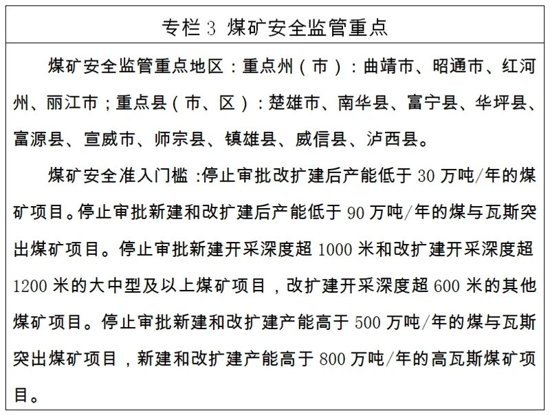 煤矿。严格控制煤矿数量,进一步提高深度开采、煤与瓦斯突出、高瓦斯等灾害严重煤矿安全准入门槛。严厉打击煤矿“五假五超三瞒三不”、擅自复工复建、借技改和隐患排查整改之名组织生产、拒不执行监管监察指令、非法私挖盗采煤炭等违法违规行为。深化瓦斯综合治理和水害、火灾防治工程。精准推进“一优三减”,大力实施“五化”改造提升工程。加快建立云南省煤矿安全监管信息化平台,建立全省统一的煤矿基础数据库、煤炭生产安全视频监测、煤矿生产能力管理、手机业务应用等系统。实施“机械化换人、自动化减人”,减少采掘工作面单班作业人数和井下同时作业人数。