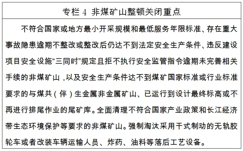 非煤矿山。严格执行非煤矿山延续和新设标准条件,加大非煤矿山整顿关闭力度。严格非煤矿山安全设施设计审查和安全生产许可管理,加强对非煤矿山建设项目安全设施竣工验收活动和验收结果的监督核查。尾矿库实行总量控制,数量原则上只减不增。严格控制新建独立选矿厂尾矿库,严禁新建“头顶库”、总坝高超过200米的尾矿库,严禁在距离金沙江(长江)干流岸线3公里、重要支流岸线1公里范围内新(改、扩)建尾矿库。深入开展尾矿库“头顶库”综合治理,对安全水平没有保障的“头顶库”采用闭库销号或升级改造、尾矿综合利用等方式进行治理。稳步推进非煤矿山信息化建设,生产地下矿山完善人员定位系统、监测监控系统和通信联络系统,在用和停用尾矿库建成在线监测系统。持续加强外包工程安全管理,对承包单位实施统一管理,做到管理、培训、检查、考核、奖惩“五统一”。