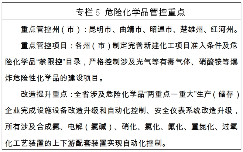 开发区。统筹开发区空间布局,合理规范开发区企业布局。明确开发区项目准入条件,制定“禁限控”目录,严格建设项目安全条件审查,严防高风险项目转移,严禁承接其他地区关闭退出的落后产能。开展园区整体性安全风险评估,有序推进园区封闭化管理。综合园区内公共设施、上下游产业链、应急救援等各环节,实施一体化管理。完善水、电、气、风、污水处理、公用管廊、道路交通、应急救援设施、消防设施、消防车通道等公用工程配套和安全保障设施。深化冶金有色等产业聚集区的安全管理,强化高温熔融金属、冶金煤气、深井铸造等重点领域执法检查,推动企业采取设备升级改造、自动化控制、联锁、机械防护和能量隔离等手段,提高本质安全水平。以昆明、曲靖、玉溪、楚雄、红河等滇中城市群快递物流园区为重点,开展危险化学品、烟花爆竹等易燃易爆、有毒有害物品储存仓库隐患排查治理,强化危险货物运输车辆及专用停车场安全管理。严格限定港口码头等功能区危险货物周转总量,强化口岸港政、海关、海事等部门的监管协作和信息通报制度。
