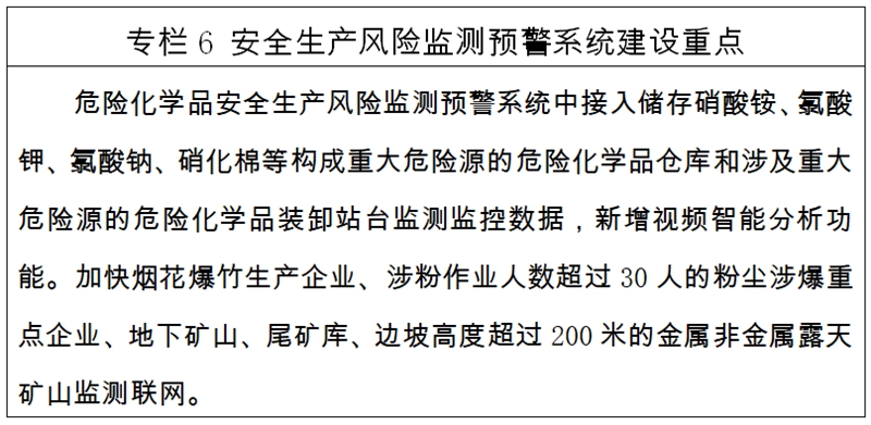 危险化学品企业风险监测预警系统建设工程。依托省级危险化学品安全生产风险监测预警系统,推进州(市)级系统使用,所有具备接入条件的危险化学品企业完成重大危险源视频监控图像和监控数据接入工作,与国家安全生产监管“一张图”平台整合、融合,逐步建成危险化学品安全监管大数据平台,逐步实现信息互通、数据共享、在线巡查、监管执法、统一指挥、应急处置等功能。