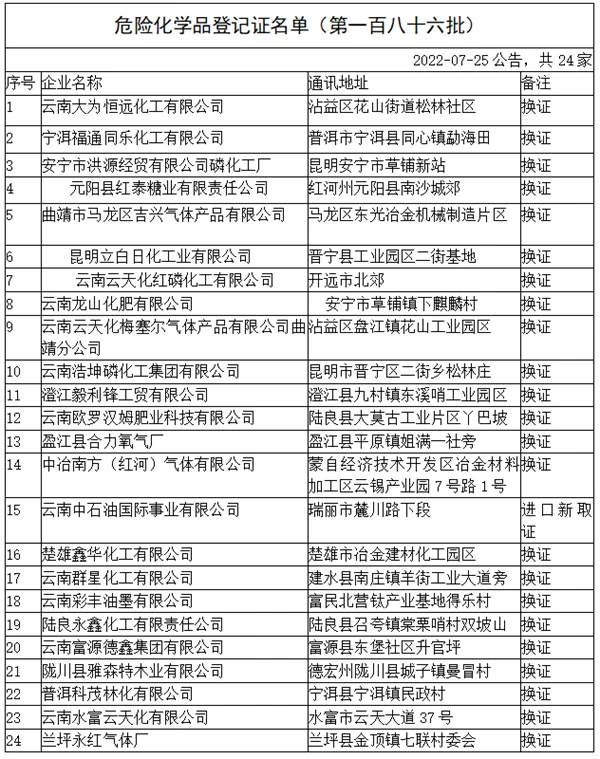 根据《危险化学品安全管理条例》《危险化学品登记管理办法》有关规定,经云南省危险化学品登记中心初审、应急管理部化学品登记中心审核合格,下列危险化学品生产、进口单位(共24家)取得《危险化学品登记证》,现予以公告。