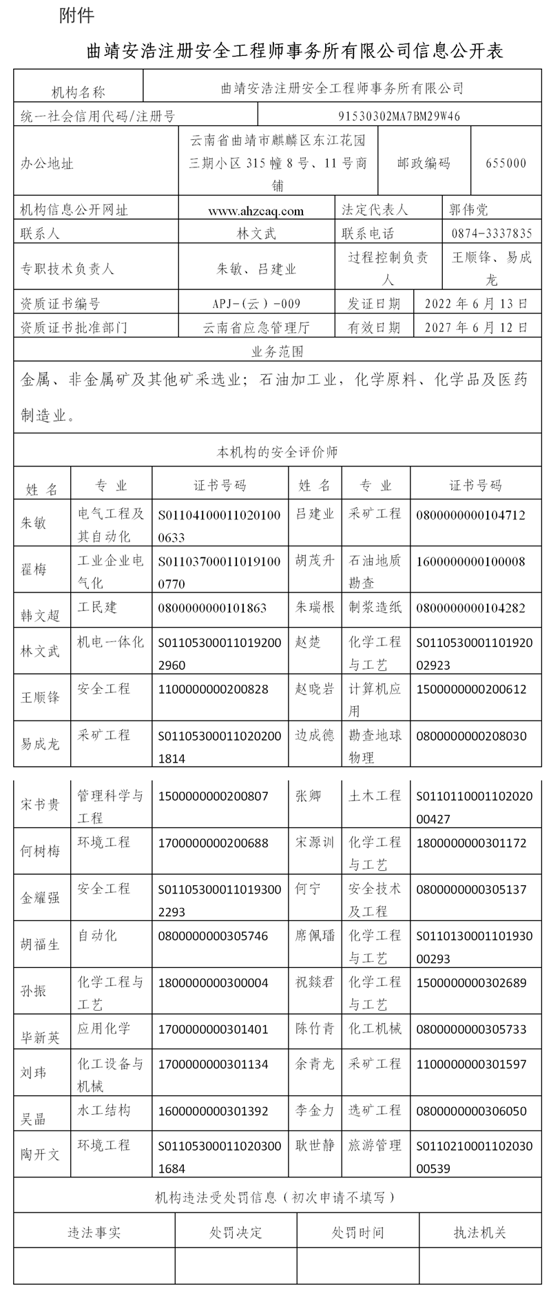 附件:曲靖安浩注册安全工程师事务所有限公司信息公开表