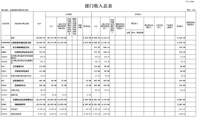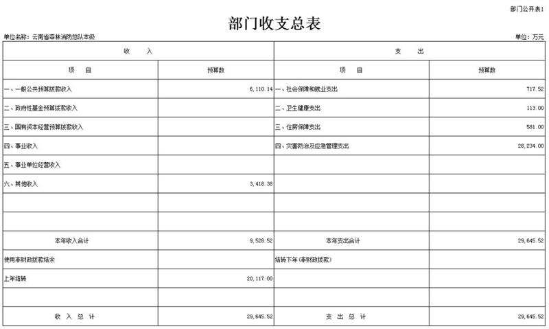 按照综合预算原则,云南省森林消防总队本级所有收入和支出均纳入部门预算管理。收入包括:一般公共预算拨款收入、其他收入、上年结转;支出包括:住房保障支出、灾害防治及应急管理支出、社会保障和就业支出、卫生健康支出。云南省森林消防总队本级2022年收支总预算29,645.52万元。