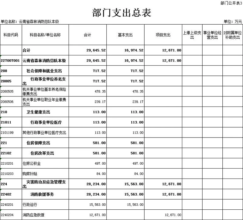 云南省森林消防总队本级2022年支出预算29,645.52万元,其中:基本支出16,974.52万元、占57.26%,项目支出12,671万元、占42.74%。