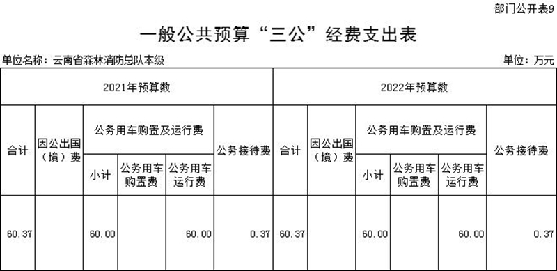 云南省森林消防总队本级2022年“三公”经费预算数为60.37万元,其中:因公出国(境)费0万元,公务用车购置及运行费60万元,公务接待费0.37万元。2022年“三公”经费预算较2021年无增加,主要是坚决落实过紧日子有关要求,确保“三公”经费不增加。