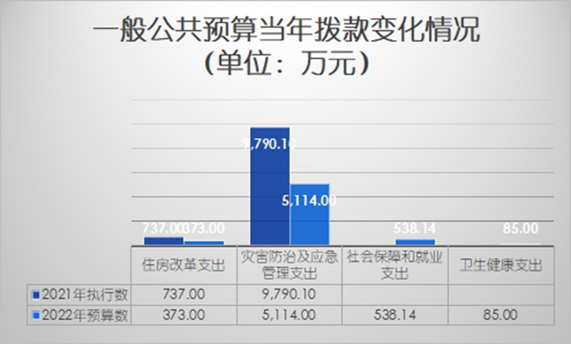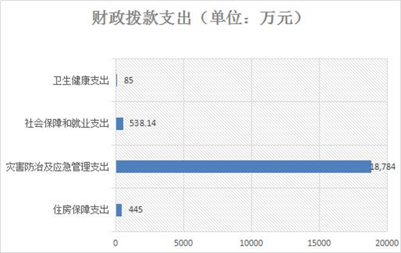住房保障支出373万元、占6.1%,灾害防治及应急管理支出5,114万元、占83.7%,社会保障和就业支出538.14万元、占2.71%,卫生健康支出85万元、占1.39%。