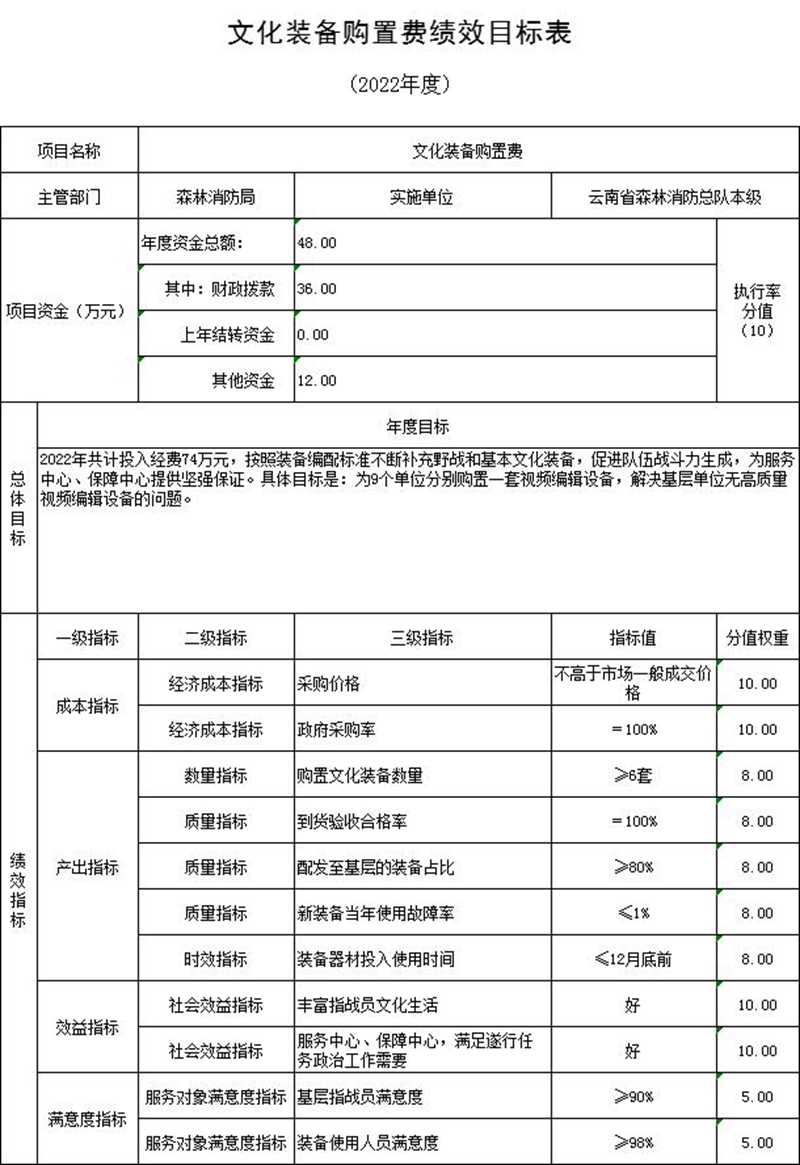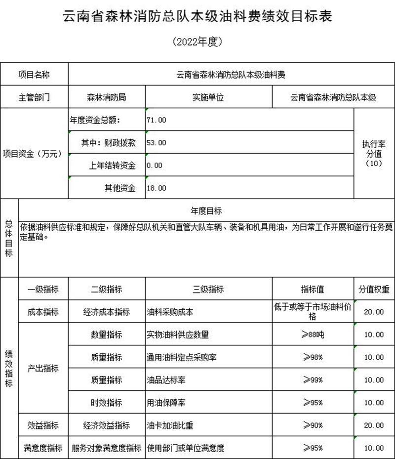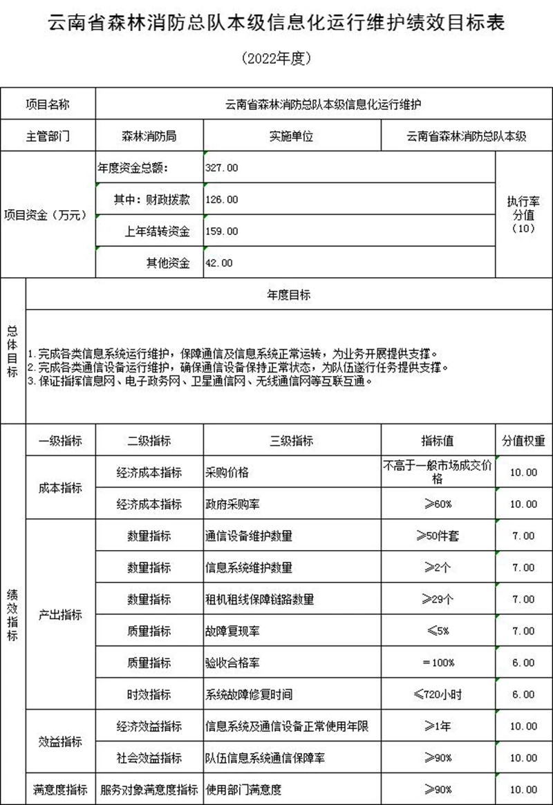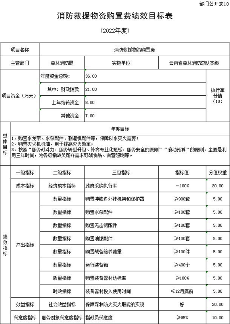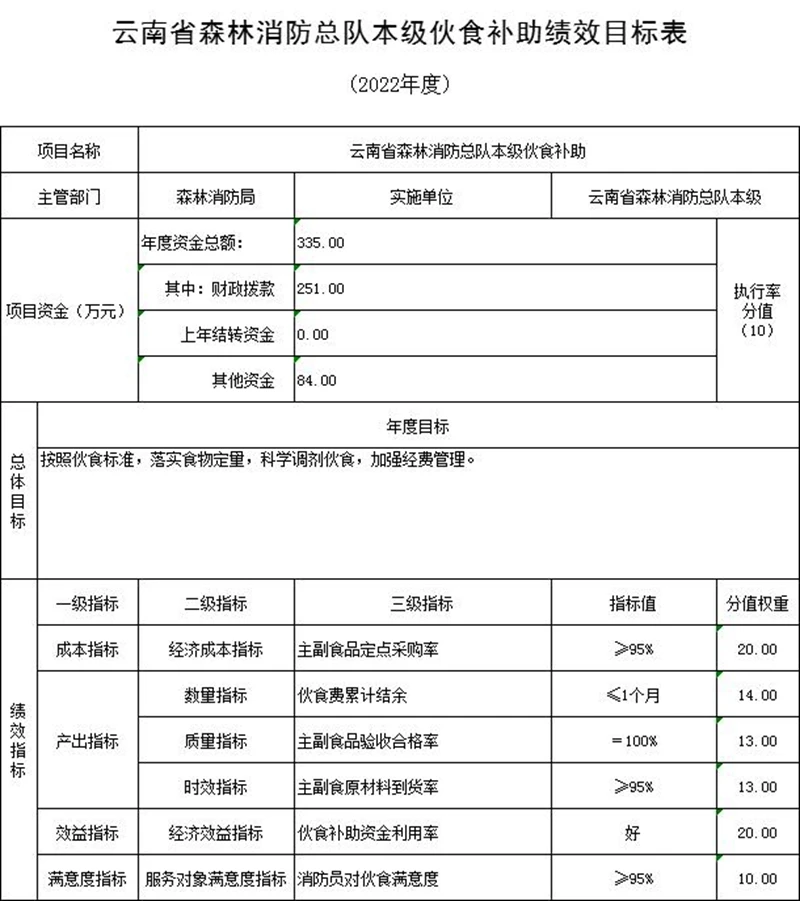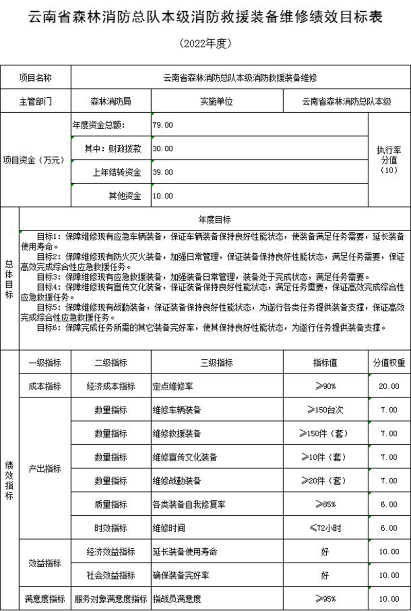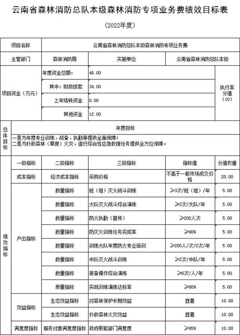 (五)预算绩效情况说明。2022年对云南省森林消防总队本级项目支出全面实施绩效目标管理,涉及一般公共预算12,671万元、一级项目7个。根据预算公开工作方案要求,云南省森林消防总队本级公开综合性消防救援专项经费、装备购置等5个一级项目绩效目标表,见“第五部分 附件”。