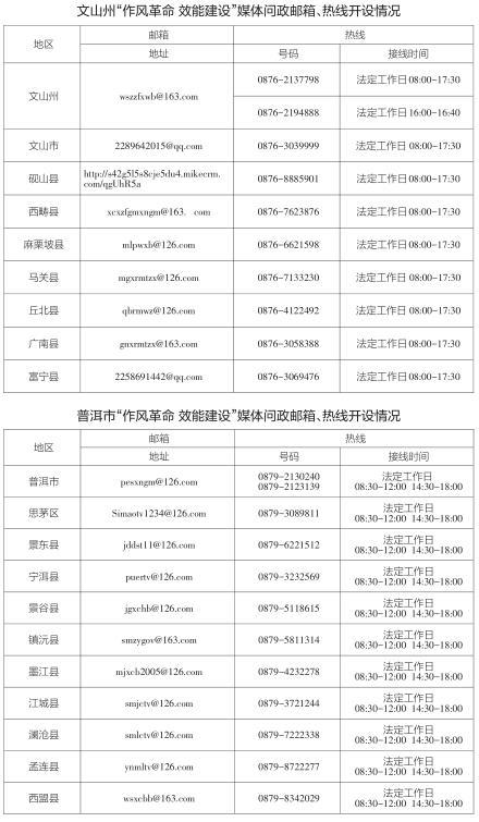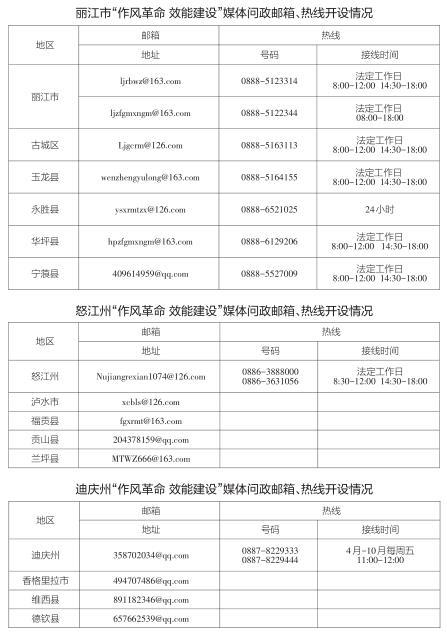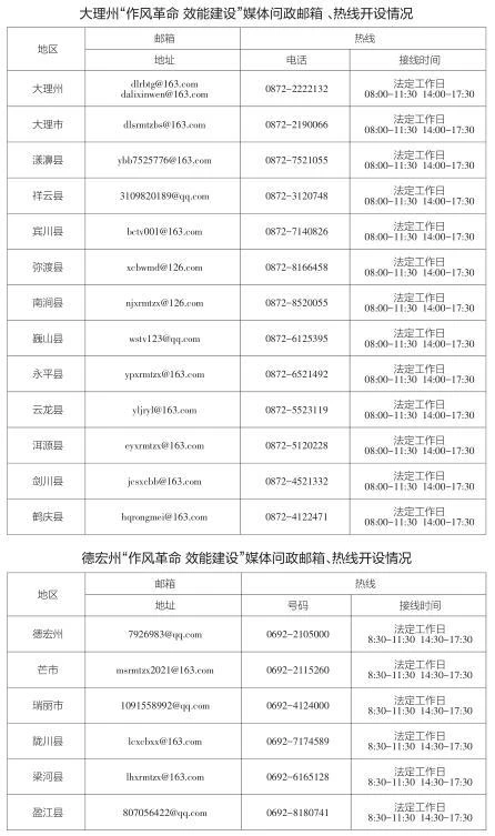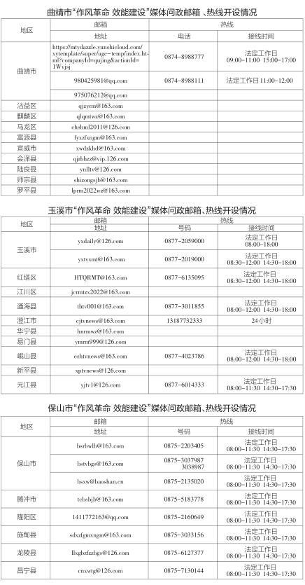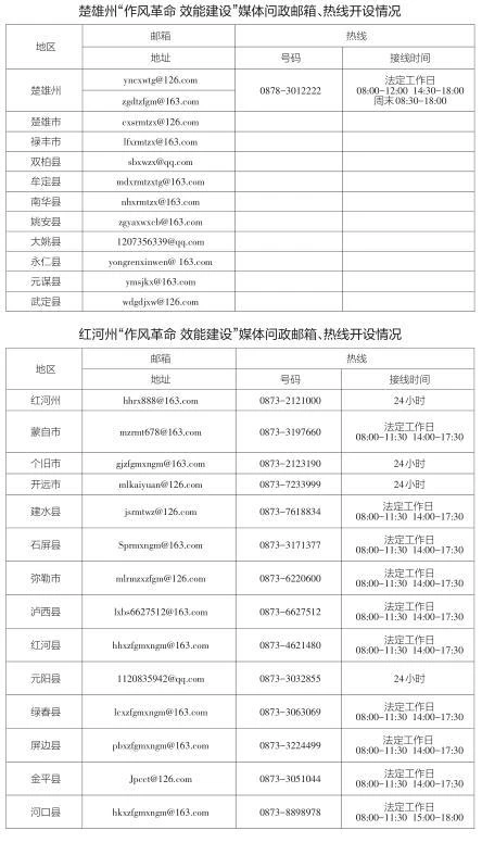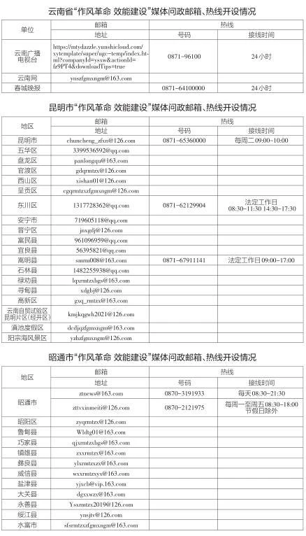 为深入贯彻落实《云南省推进作风革命加强机关效能建设的若干规定(试行)》,即日起,我省将全面开展“作风革命 效能建设”媒体问政工作。全省各级媒体将面向社会公众开设“作风革命 效能建设”问政专区,采用电子邮箱、广播电视专题节目、热线电话等多种形式畅通群众、基层、企业诉求渠道,广泛收集各类意见建议,开展舆论监督。欢迎广大群众、各类企业就全省各地区各部门在转变作风、提升效能,服务群众、服务基层、服务企业过程中存在的不良现象、典型问题,积极提供相关新闻报道线索。各级媒体将及时把意见建议和问题线索反馈至有关部门,持续跟踪问效,推进问题解决。