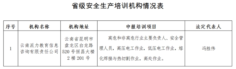 云南派力教育信息咨询有限责任公司向省应急厅提交办理安全生产培训机构的申请及有关材料。根据《中华人民共和国安全生产法》《安全培训机构基本条件》(AQ/T8011-2016)、《云南省安全生产监督管理局关于印发云南省安全生产培训机构备案条件与程序的通知》(云安监管〔2018〕32号)、《云南省应急管理厅办公室关于进一步加强安全生产培训工作管理的通知》(云应急办函〔2022〕55号)和《云南省应急管理厅办公室关于进一步规范安全生产培训管理工作的通知》等有关文件精神,经组织书面审查、现场核验,云南派力教育信息咨询有限责任公司申请事项符合上述法规和文件规定要求,同意其作为省级安全生产培训机构开展相关业务工作,现予以公告。