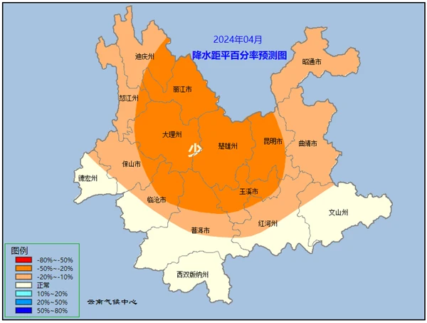 降水。预计,4月份降水德宏州、临沧市南部、普洱市南部、西双版纳州、红河州南部、文山州接近常年,其余大部地区降水偏少,其中昆明市西部、玉溪市、普洱市北部、临沧市北部、楚雄州、大理州、丽江市、迪庆州东部偏少20%~50%。(见图1)