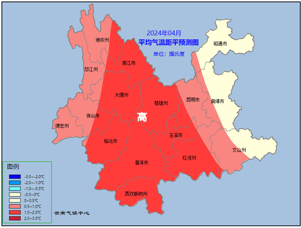 气温。预计,4月份气温昭通市、曲靖市、文山州东部接近常年,其余大部地区偏高,其中昆明市西部、玉溪市、红河州大部、楚雄州、普洱市、西双版纳州、临沧市、保山市东部、大理州大部、丽江市大部偏高1.0℃~2.0℃。(见图2)