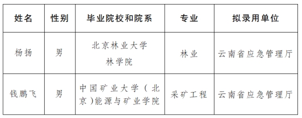 按照公务员法和公务员录用相关规定,经过笔试、面试、考察等工作程序,拟录用杨扬、钱鹏飞2名同志为云南省应急管理厅2024年定向选调生,现予以公示。公示期为2024年5月13日至5月17日。