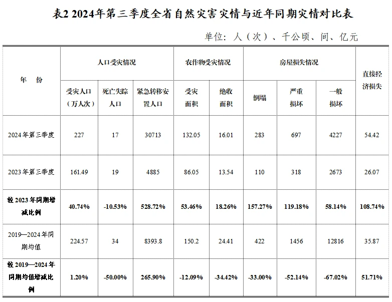 2024年第三季度灾情与去年同期相比,受灾人口、农作物受灾面积、房屋一般损坏、直接经济损失分别增加40.74%、53.46%、58.14%、108.74%。与近5年同期均值相比,受灾人口、直接经济损失分别增加1.20%、57.71%,农作物受灾面积、房屋一般损坏分别下降12.09%、67.02%