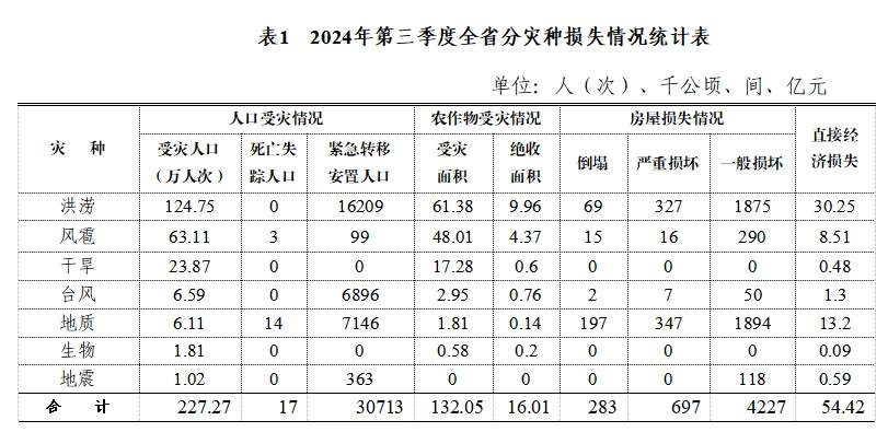 7—9月,我省自然灾害以洪涝灾害、地质灾害、风雹灾害为主,地震灾害、台风灾害、生物灾害、干旱灾害不同程度发生,共造成16个州(市)125个县(市、区)227.27万人次不同程度受灾,因灾死亡17人,紧急转移安置30713人次;农作物受灾面积132.05千公顷,其中绝收面积16.01千公顷;房屋倒塌283间,严重损坏697间,一般损坏4227间;灾害造成直接经济损失54.42亿元。