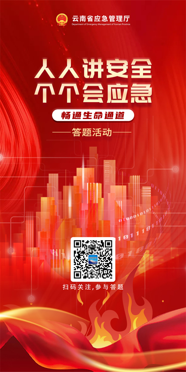 今年6月是第23个全国“安全生产月”,为不断提升公众风险防范、安全应急意识和自救互救能力,营造浓厚安全氛围,6月3日起,云南省应急管理厅开展为期4周的“人人讲安全、个个会应急——畅通生命通道”有奖答题活动。