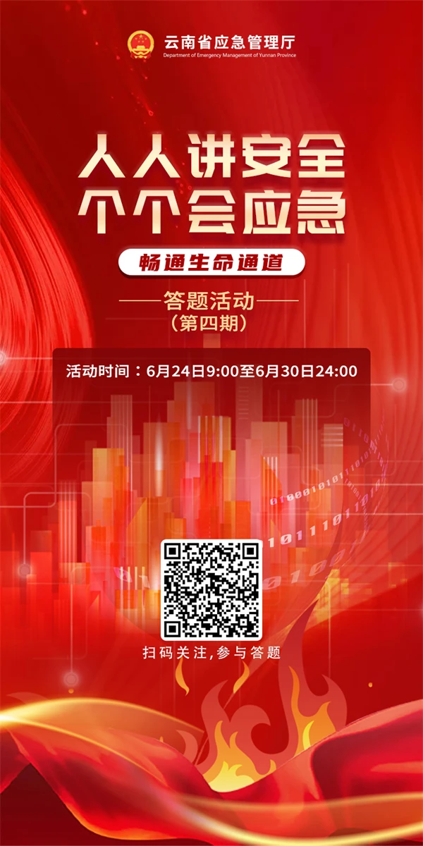 今年6月是第23个全国“安全生产月”,为不断提升公众风险防范、安全应急意识和自救互救能力,营造浓厚安全氛围,6月3日,云南省应急管理厅微信公众号启动了“人人讲安全、个个会应急——畅通生命通道”有奖答题活动。