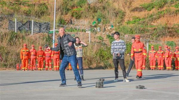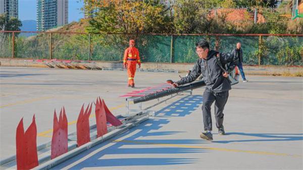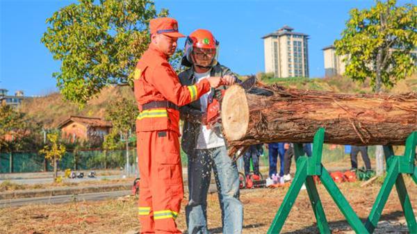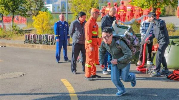 交流结束后,全体同志到训练场体验集训队员训练科目,在教练员的指导下,开展了水泵架设与撤收、灭火弹投掷、风力灭火机和油锯操作等训练。