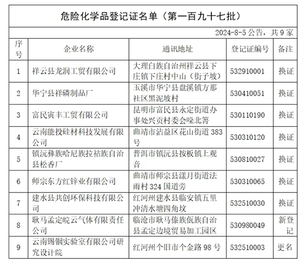 根据《危险化学品安全管理条例》《危险化学品登记管理办法》有关规定,经云南省危险化学品登记中心初审、应急管理部化学品登记中心审核合格,下列危险化学品生产、进口单位(共9家)取得《危险化学品登记证》,现予以公告。
