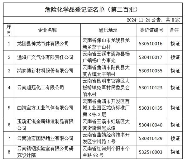 根据《危险化学品安全管理条例》《危险化学品登记管理办法》有关规定,经云南省危险化学品登记中心初审、应急管理部化学品登记中心复审合格,下列危险化学品生产、进口单位(共8家)取得《危险化学品登记证》,现予以公告。