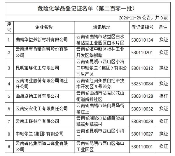 根据《危险化学品安全管理条例》《危险化学品登记管理办法》有关规定,经云南省危险化学品登记中心初审、应急管理部化学品登记中心复审合格,下列危险化学品生产、进口单位(共9家)取得《危险化学品登记证》,现予以公告。