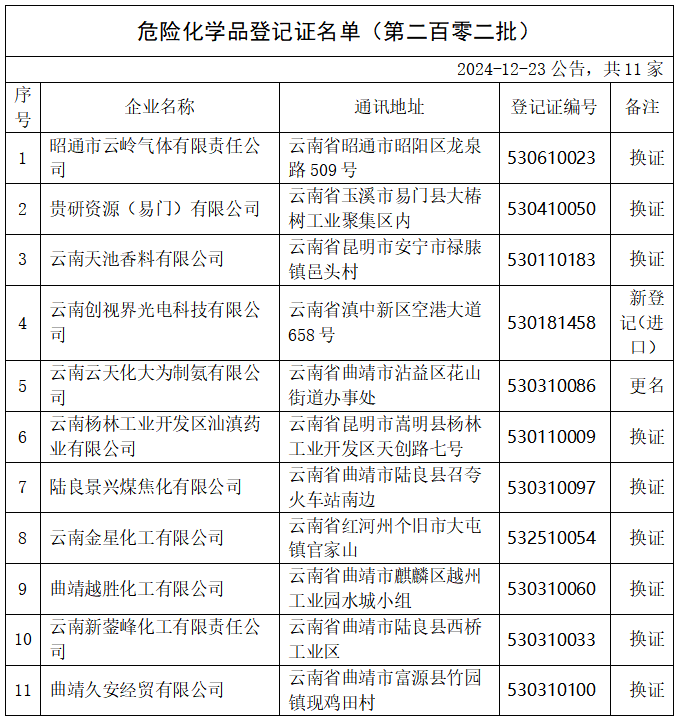 根据《危险化学品安全管理条例》《危险化学品登记管理办法》有关规定,经云南省危险化学品登记中心初审、应急管理部化学品登记中心复审合格,下列危险化学品生产、进口单位(共11家)取得《危险化学品登记证》,现予以公告。