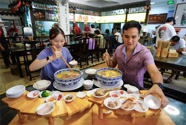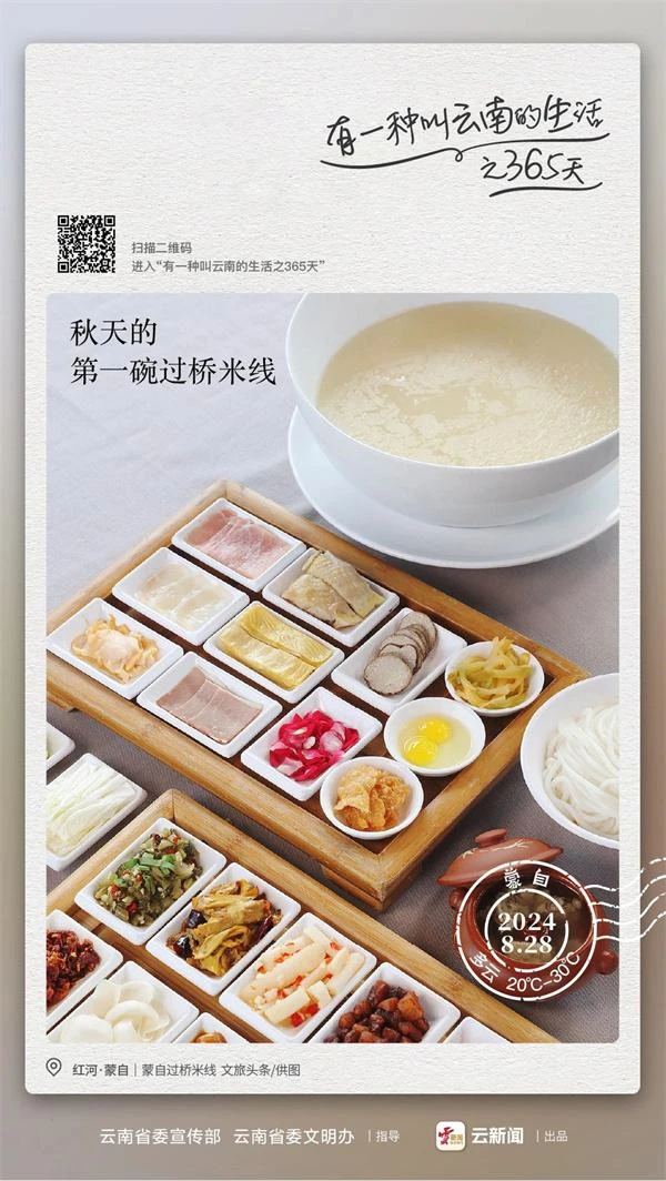 云南省红河哈尼族彝族自治州蒙自市的过桥米线历史悠久,距今已有300多年历史,被誉为“中国过桥米线之乡”。在蒙自市,过桥米线不断传承创新发展,获得“蒙自过桥米线”地理标志证明商标。2014年,蒙自过桥米线制作技艺被列入国家级非物质文化遗产代表性项目名录。据统计,蒙自市现有各类米线经营主体1800余家,从业人员约2万人,年营业收入近10亿元。如今,过桥米线早已成为云南最具代表性的美食之一。