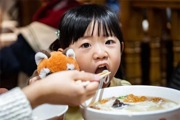 从江西南昌到昆明旅游的小朋友在昆明市宝善街品尝过桥米线。新华社记者 胡超 摄