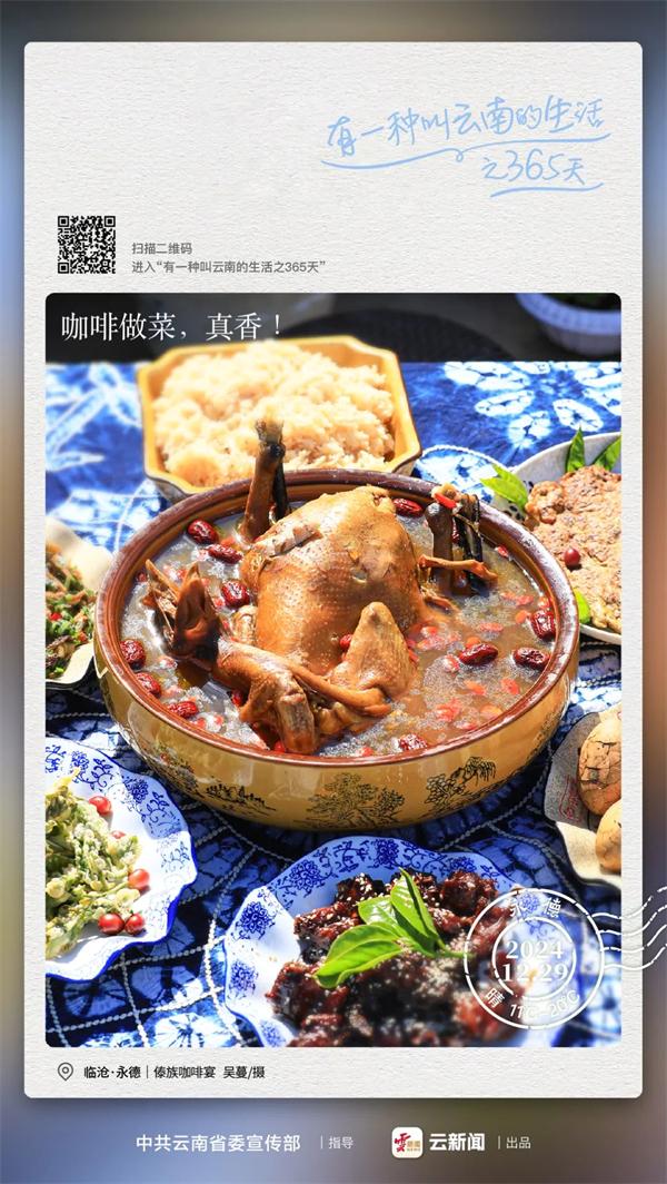 入冬后,云南省临沧市永德县的咖啡相继进入了成熟采摘期。在大雪山乡,满山的咖啡果如红宝石般挂满枝头,生活在这里的傣族群众不仅喝咖啡,还将咖啡叶、咖啡花、咖啡豆入菜,做成一桌美味的“咖啡宴”。