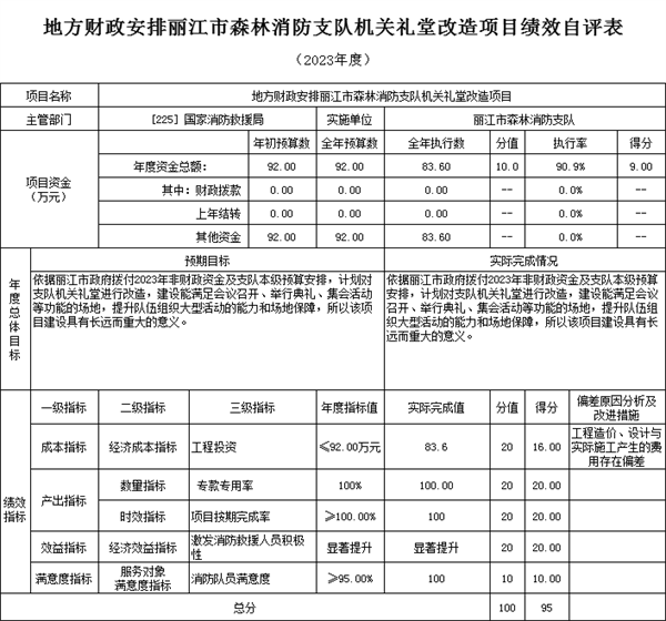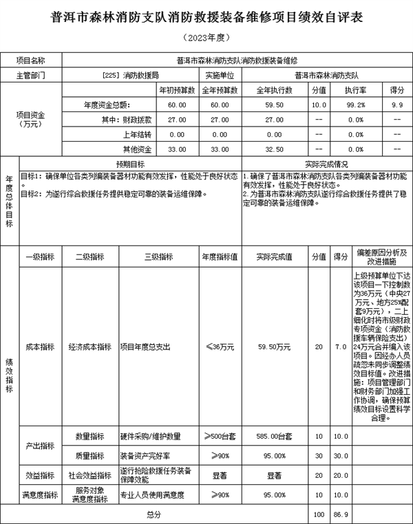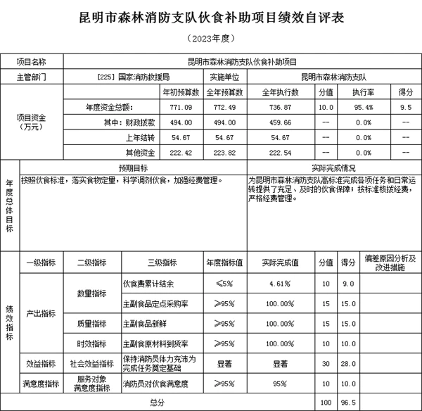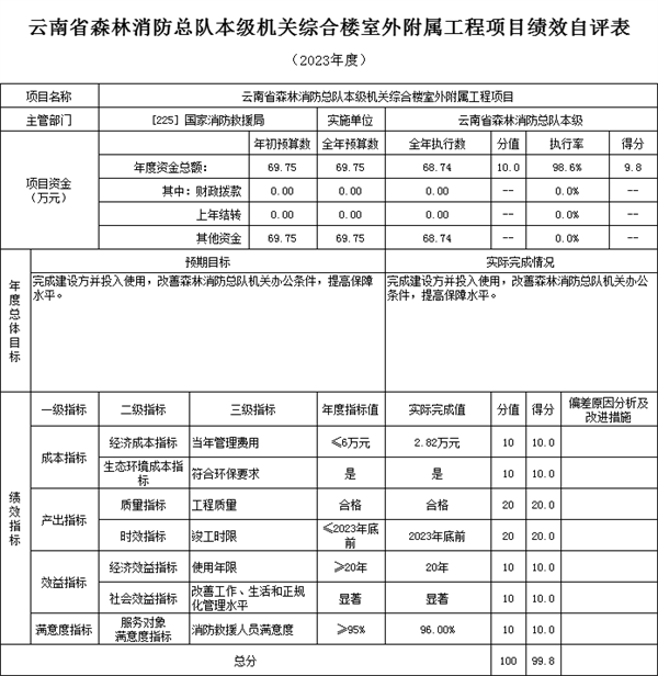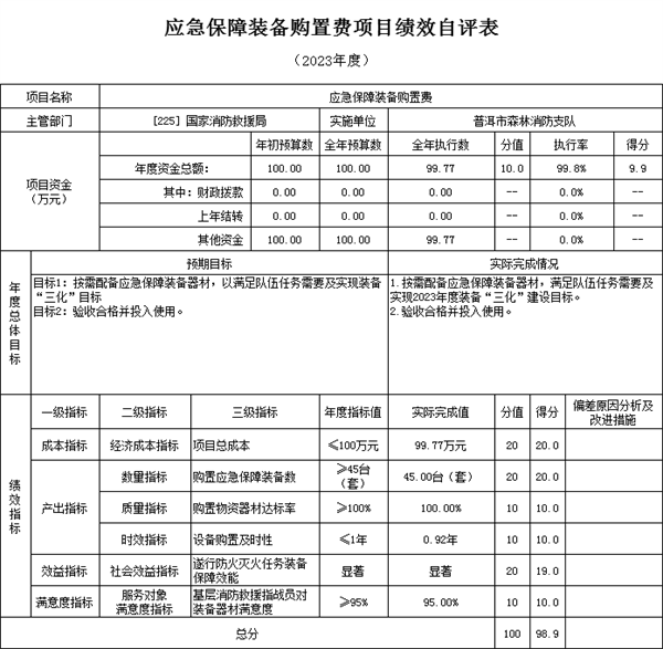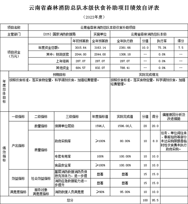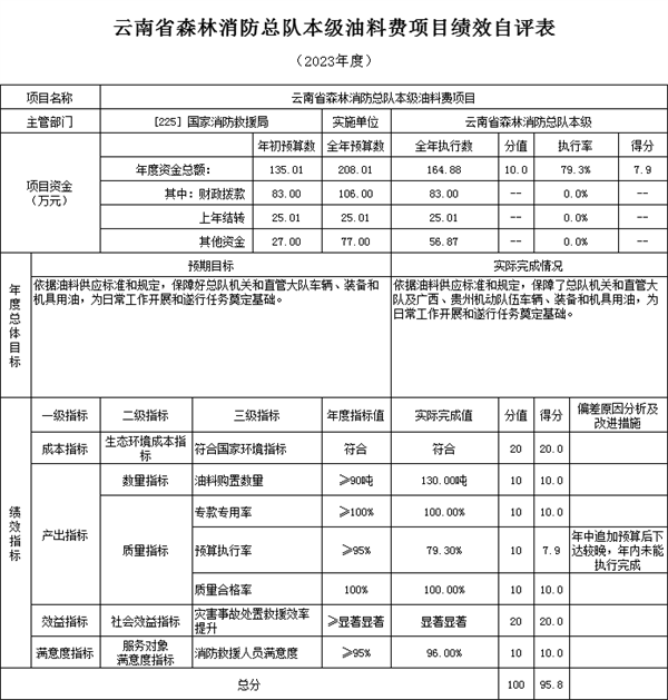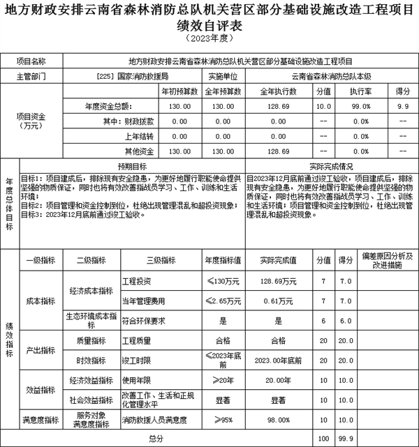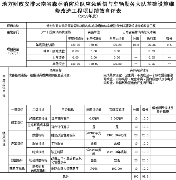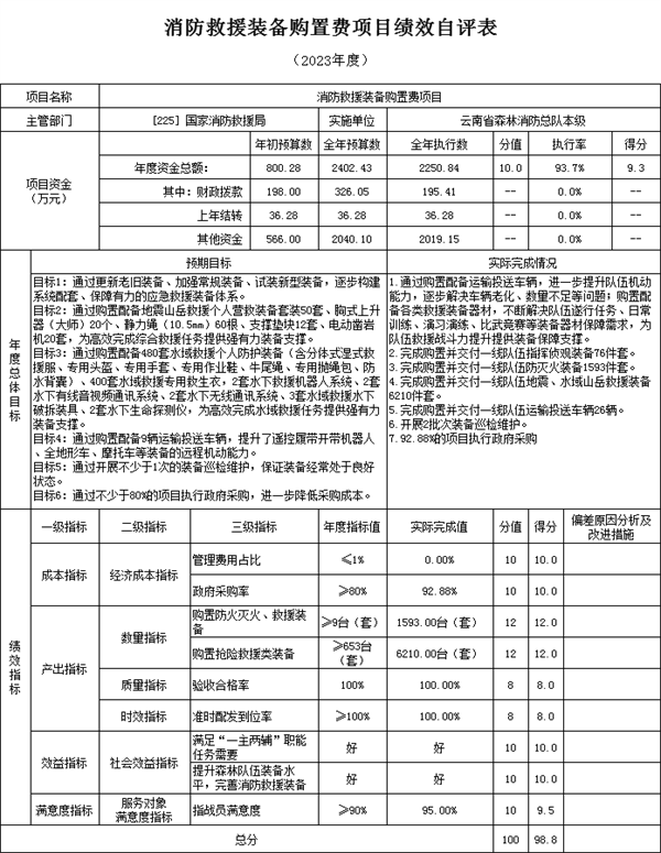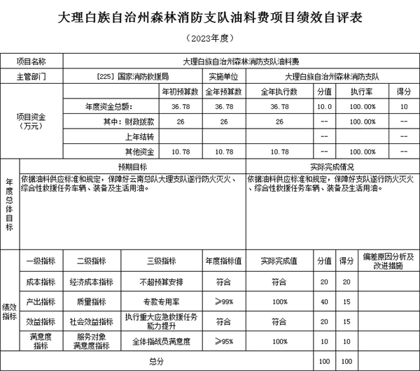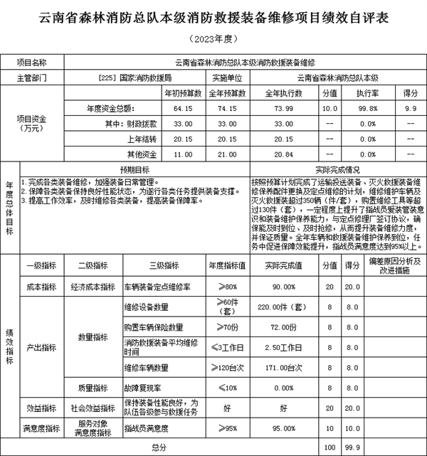 按照国家消防救援局单位整体支出绩效评价工作安排,云南省森林消防总队参加了国家消防救援局整体支出绩效评价。评价实施中,制定了“云南省森林消防总队2023年度整体支出绩效评价指标体系”,通过目标设定、预算配置、预算执行、预算管理、资产管理、职责履行、社会效益、满意度等八个方面明确了指标体系,从森林消防安全综合工作、队伍正规化建设、消防救援基础建设、消防救援队伍和能力、区域森林消防安全、全民森林消防安全素质、群死群伤等重特大火灾事故发生数量等七个重点分项内容细化核心产出效益。依据绩效评价组和专家反馈意见,主要从以下方面进行改进:
