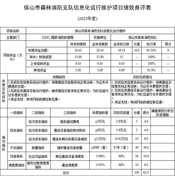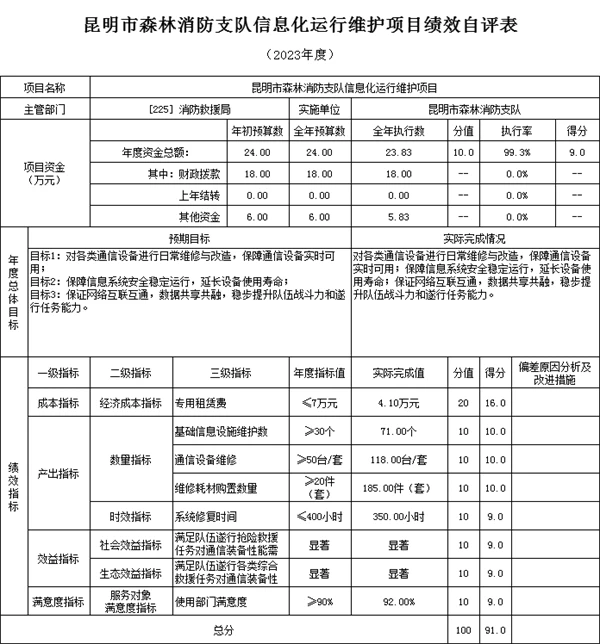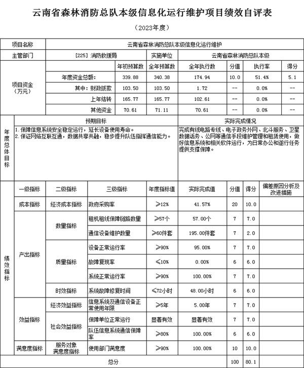 7.信息化运行维护。该类项目主要用于租赁现有无线、卫星、北斗、公网和其他需要租赁的有线网络等,保障无线网通信、卫星网通信、公网设备等运行;通信设备维修维护用于装备设备维护修理、部分耗材配件和维修工具购置等;信息系统维修维护用于网络机房、数据网络系统、电视会议系统、业务系统的维护维修,保障各类系统正常运行,确保通信工作正常开展。该类项目自评“优”等次项目3个、“良”等次项目2个、“中”等次项目1个。“中”等次项目绩效管理存在的问题是预算执行缓慢,主要是计划由总队实施的政务网建设,调整由国家消防救援局统一实施,总队涉及资金未做支出。
