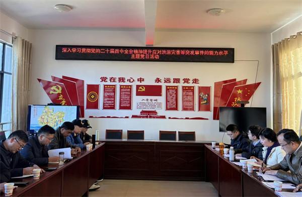 活动中,省应急管理厅水旱处党支部书记领学党的二十届四中全会公报、《中共中央关于制定国民经济和社会发展第十五个五年规划的建议》及相关重要解读文章;昆明市应急管理局有关负责同志传达学习全省防汛救灾工作总结会议精神;寻甸县、功山镇有关负责同志、朵马嘎村党总支书记及驻村工作队队员,与会党员围绕进一步提升基层应急管理能力,对本地区、本部门、本人在防汛减灾救灾工作中的认识体会进行交流发言,在健全法律法规、完善预案体系、强化科技支撑、加强队伍建设和物资保障、普及防灾知识等方面建言献策。