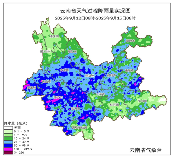 9月12日至14日,我省西部、西南部和中部等地出现强降雨,过程平均雨量34.9毫米,最大小时雨量69.0毫米,出现在河口县河口镇河口站。