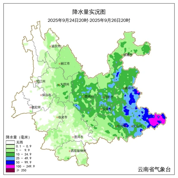 受台风“桦加沙”外围气流影响,9月24日至26日,我省东南部和中东部出现强降雨,过程平均雨量11.2毫米,最大小时雨量31.0毫米,出现在文山州富宁县木央镇木兄坪站。