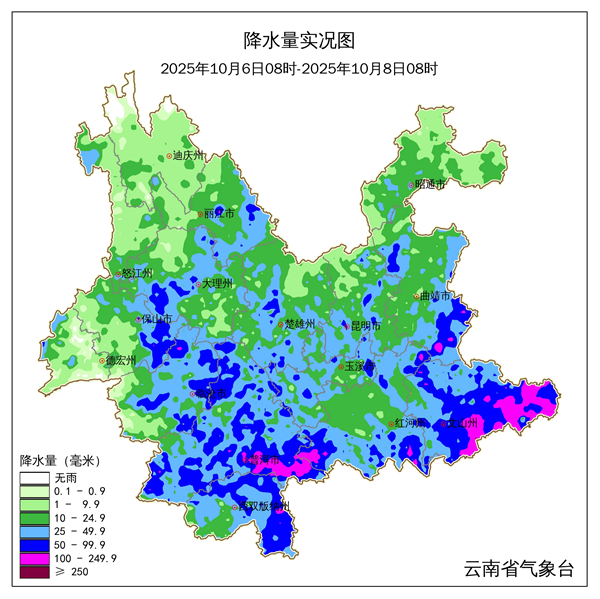 受台风“麦德姆”影响,10月6日至7日,我省中部和南部出现强降雨,过程平均雨量32.5毫米,最大小时雨量88.3毫米,出现在普洱市思茅区思茅街道莲花站。