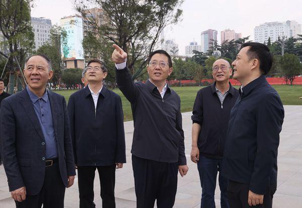 王予波在昆明市东风广场察看恢复工程效果及周边环境风貌。